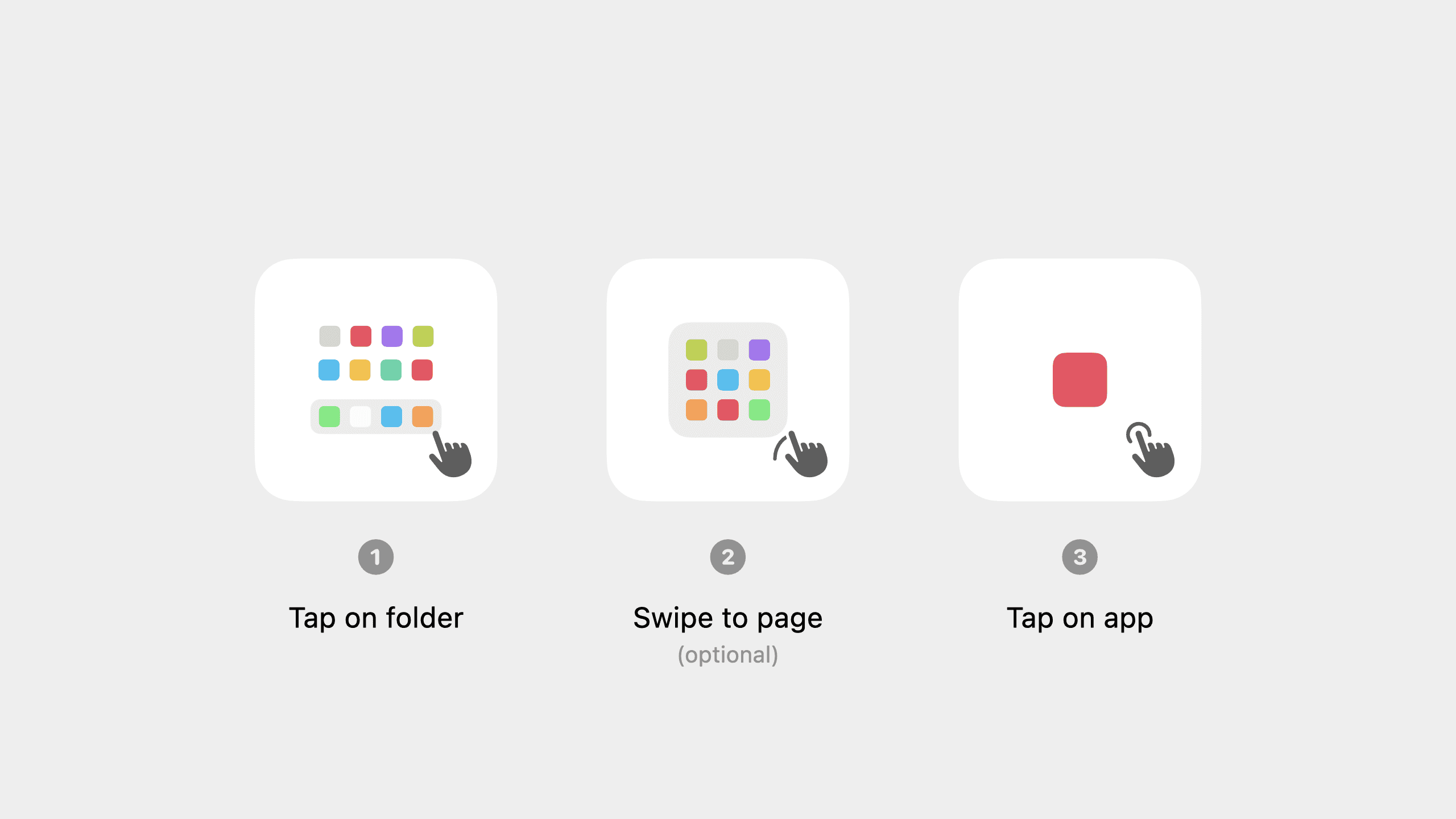Open apps in folders with a single, interruptable hold-and-scrub gesture. The target app opens upon release. Easily identify folders using a customizable category icon.