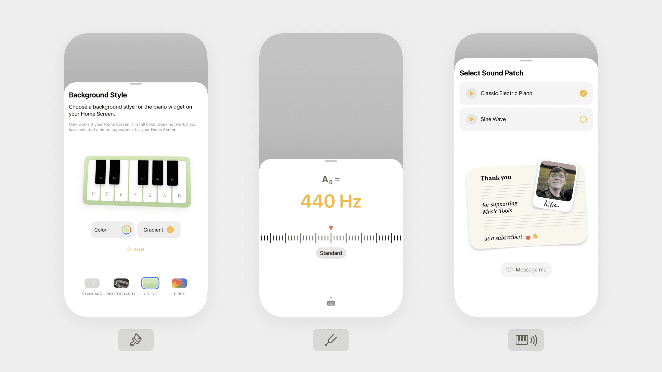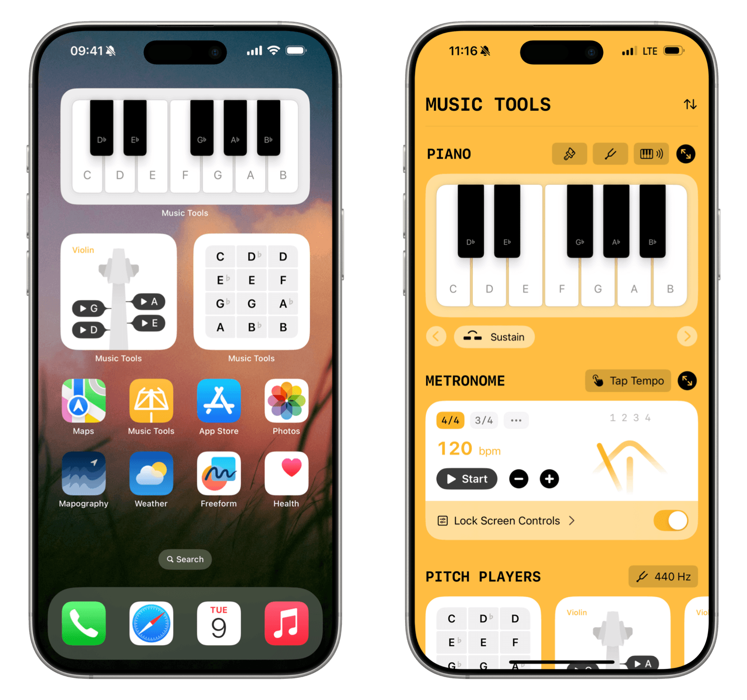Color and typography convey a strong visual identity that still feels restrained and native. Music Tools pays tribute to two major musical traditions, with a modern and a classical theme that even extend to the app icon.