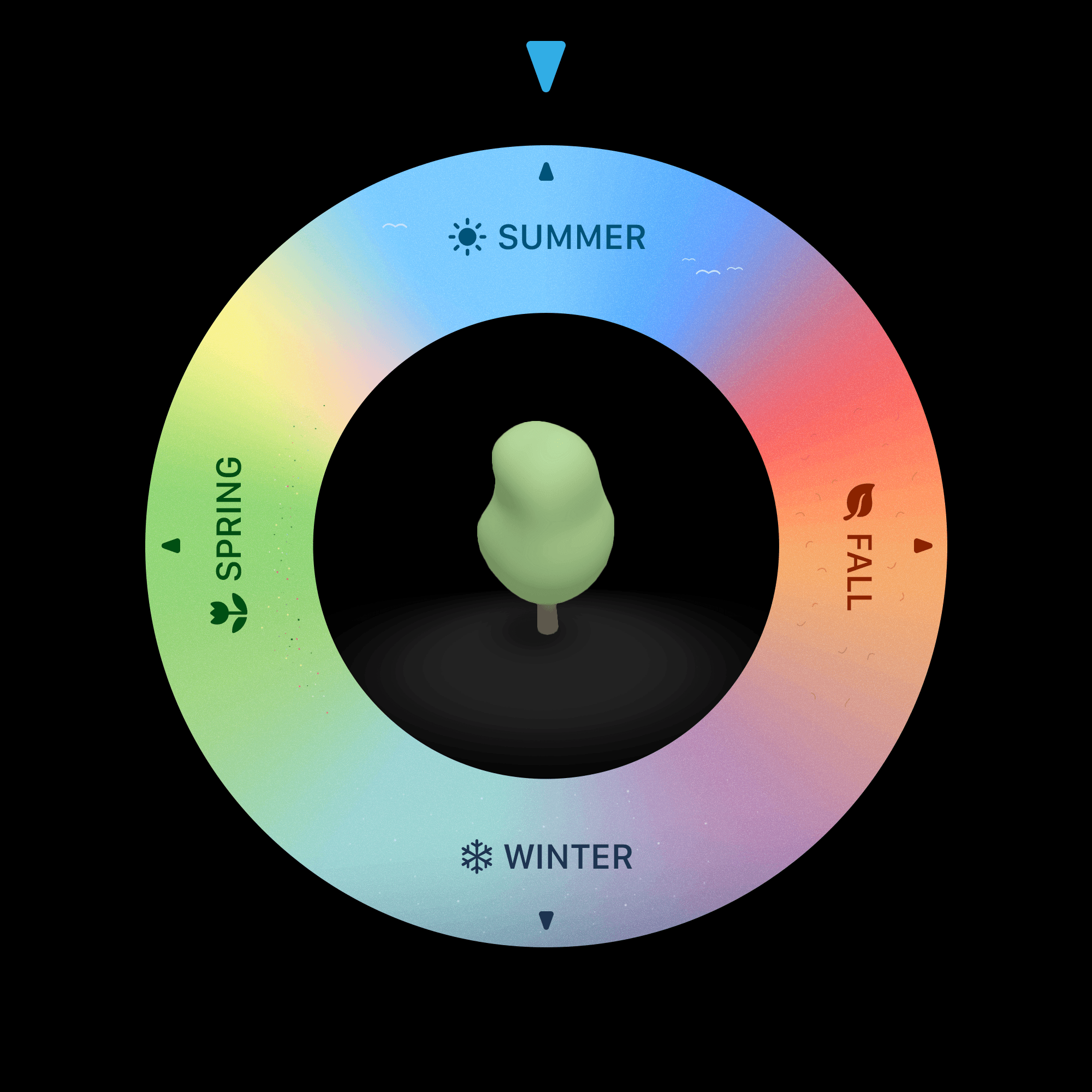 For Mapography's fictional map, I designed a custom season picker inspired by the iPod click wheel. It gives users a direct, familiar way to explore seasonal changes. As the picker rotates, foliage across the map updates to match, from spring greens to fall tones, adding a layer of visual context that feels both subtle and intuitive.