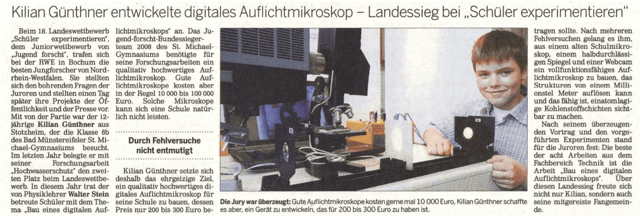 Newspaper Excerpt: “Kilian Günthner Developed Digital Reflected Light Microscope - First in State Level Science Competition”. Learn more.